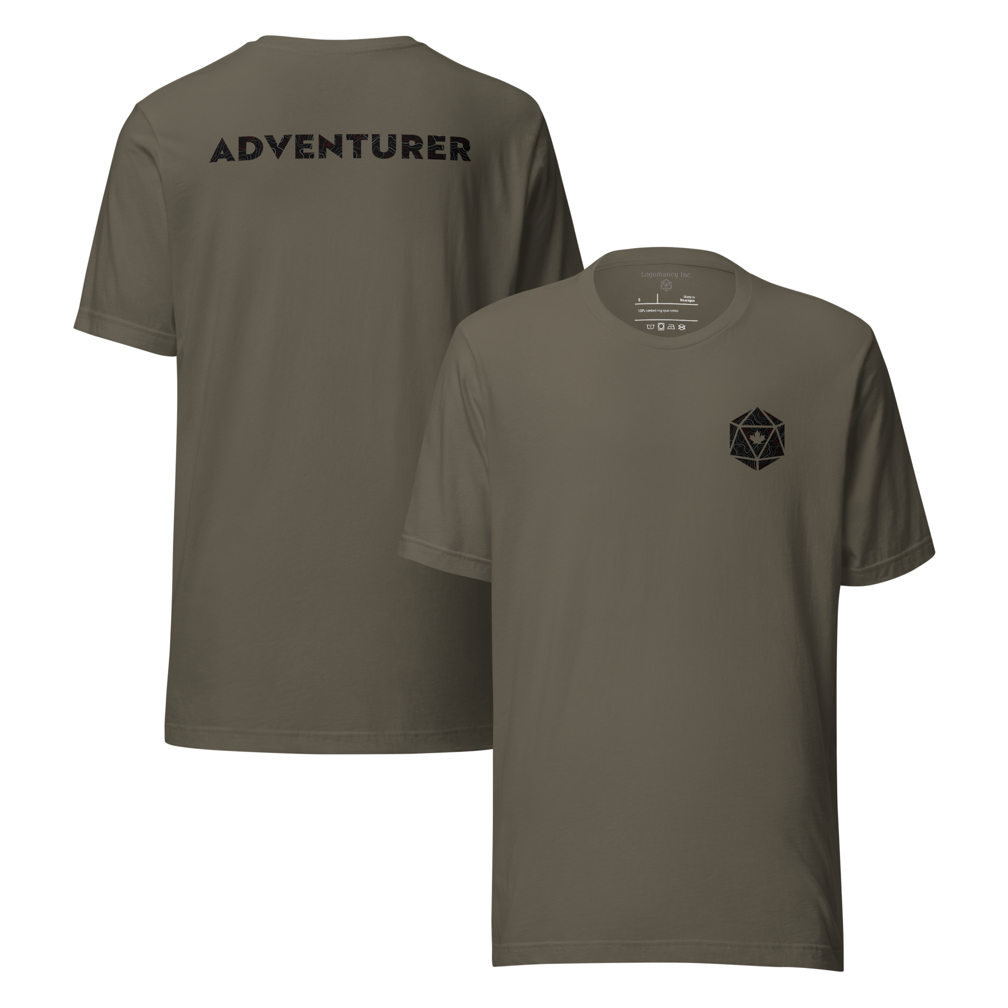 It's our D20 logo, emblazoned with a gentle topography pattern. All dude bros love a good topography pattern. The word "Adventurer" is on the back with the same pattern. With a printed label on the inside and made of comfortable ring-spun cotton, this is the kind of shirt that screams "I am a nerd who also drives a Tacoma." It adds a +2 to your charisma modifier while holding a fish or drinking craft beer.
